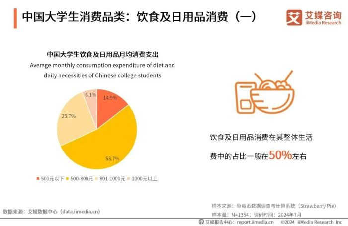 艾媒咨询数据显示,53.7%的大学生平均每个月在饮食及日用品上的消费支出为500-800元,801-1000元的占比为25.7%,而在1000元以上的占比仅为6.1%